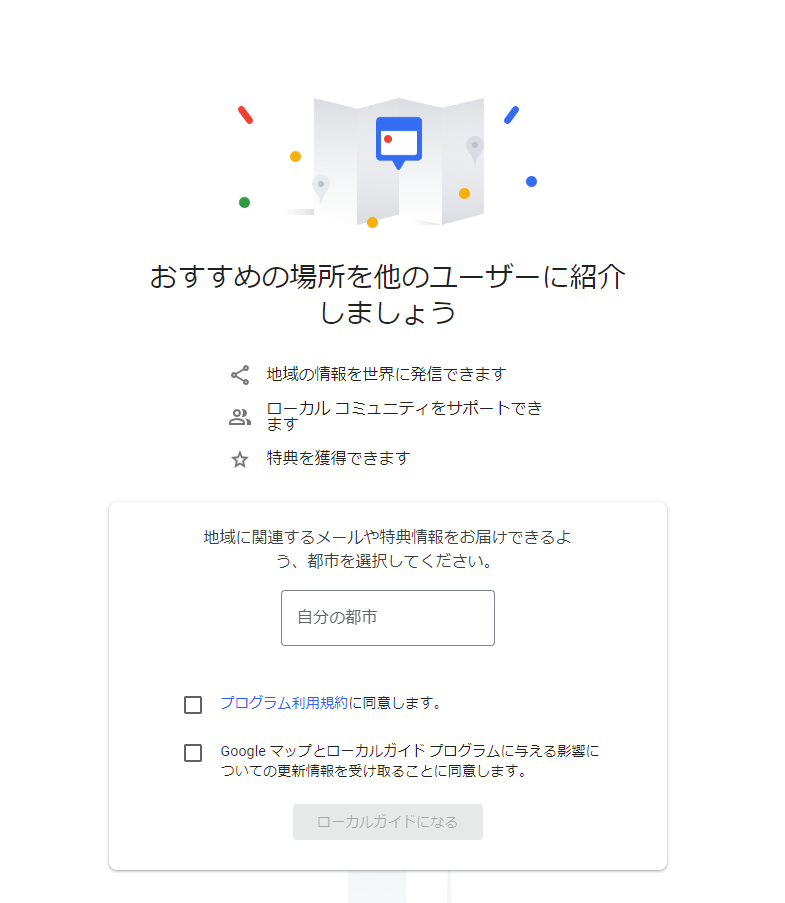 登録はいたって簡単で、ローカルガイド登録のページから自分が住んでいる都市を入力し、規約に同意するだけです。