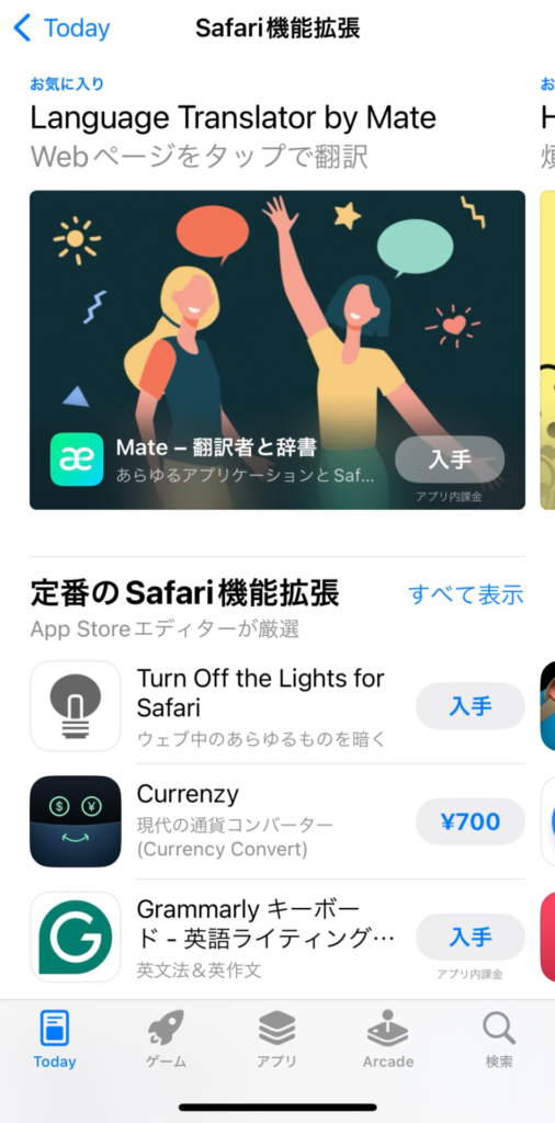 Google Chromeではページの翻訳機能がデフォルトで搭載されていますが、Safariにはその機能がありません。そこでご紹介したいのが「Mate – 翻訳者と辞書」です。