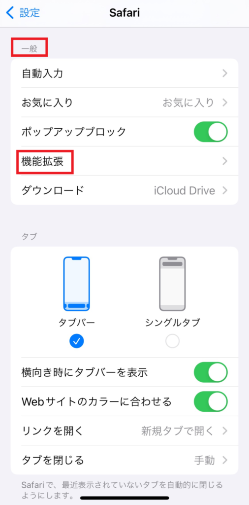 まず、設定→Safariを選択して、一般→機能拡張を選択します。