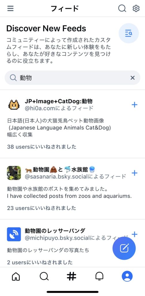 例えば、「動物のポストをたくさん見たい」という方は、フィードを検索する画面で「動物」と検索して、フィードを追加することができます。