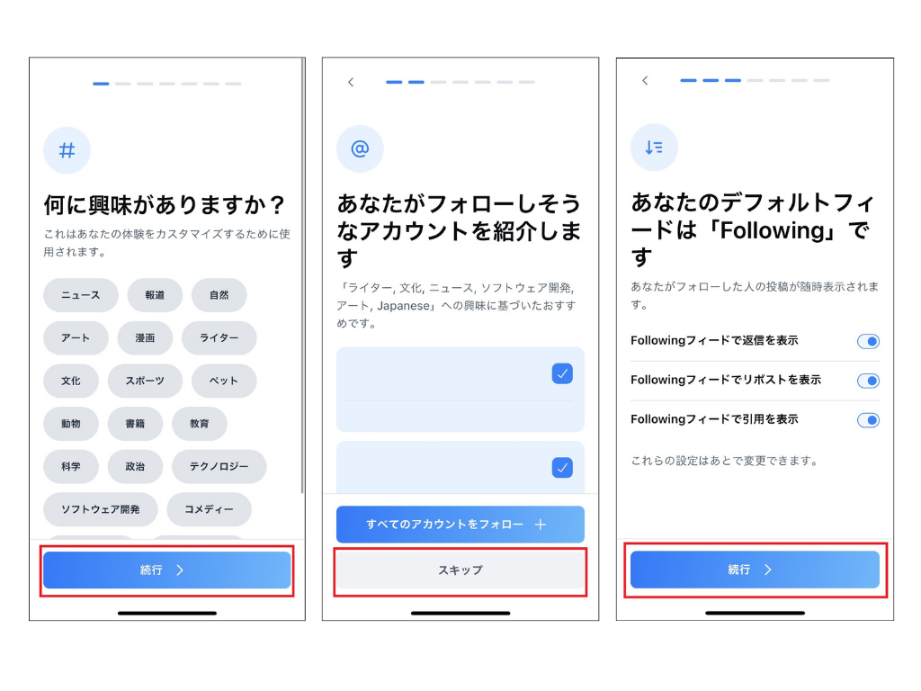 次の画面では、フォローした人の投稿についての設定をします。設定は後でも変更できるので、使い方が分かってから変えても大丈夫です。