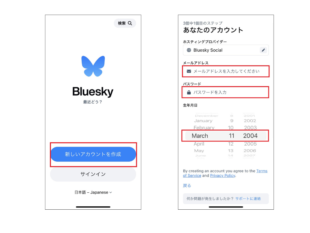 まずは、新しいアカウントを作成から、メールアドレスとパスワード、そして生年月日を入力します。