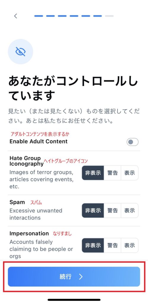 自分が見たくない情報をどのように処理するかを選んで続行してください。