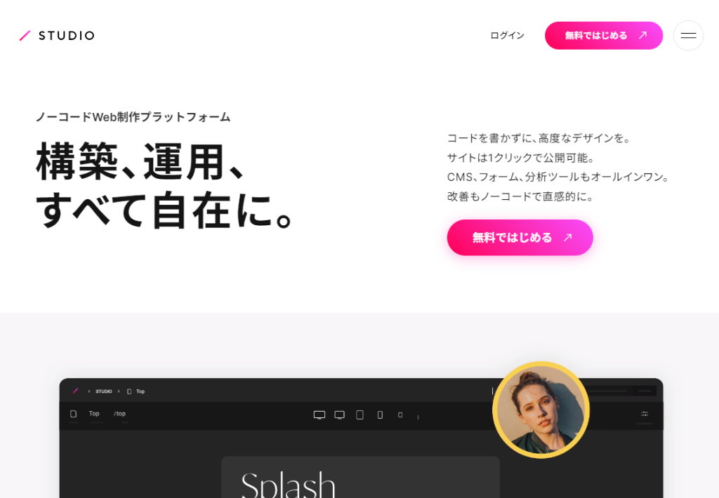 STUDIO(スタジオ)は、さまざまな企業や団体で導入されているノーコードツールです。ペライチに比べるともう少し発展したホームページを制作できる印象です。無料で利用できるだけでなく、デザイン性に優れたホームページを作ることができます。