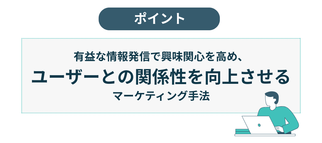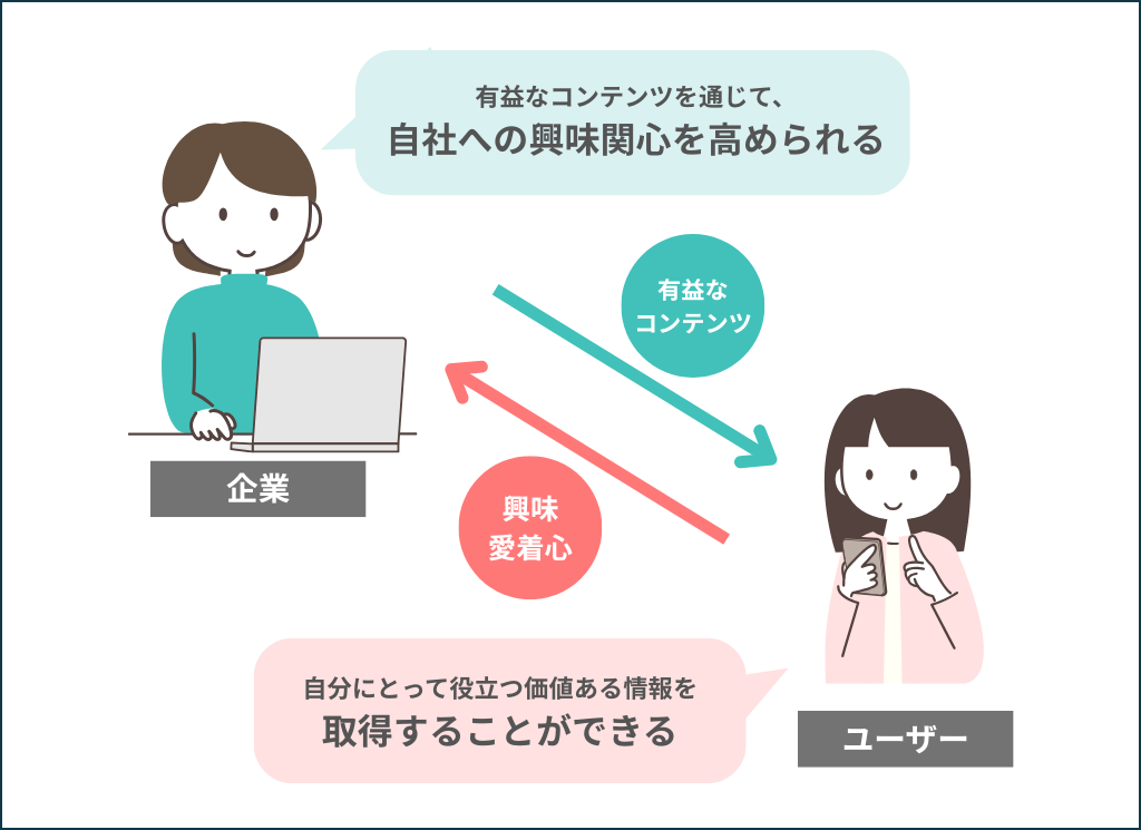 一方でコンテンツマーケティングは、顧客となり得るユーザーに対して有益な情報を発信することで興味関心を高め、より良い関係性構築を目指すコミュニケーションを目的としています。