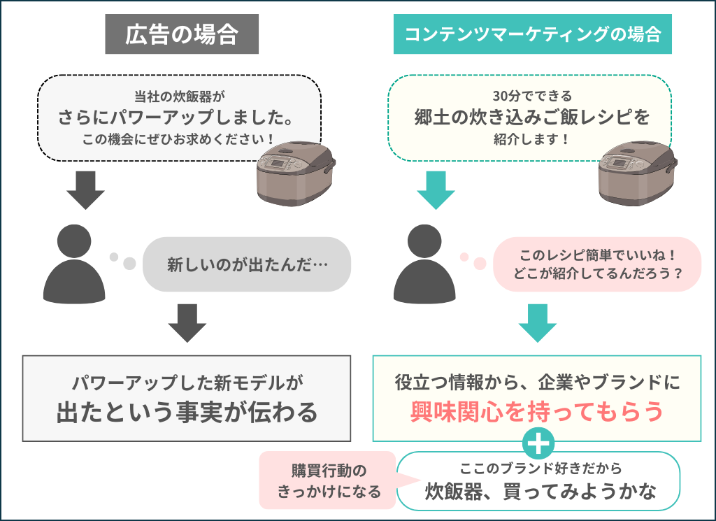しかし、「30分でできる、郷土の炊き込みご飯レシピを紹介します!」などユーザーが興味を持ってくれそうな情報を含めたブログ記事を作ってみるとどうでしょうか?ブログ記事を読んだユーザーは、すぐに作れる炊き込みご飯のレシピという有益な情報に満足することで、情報発信元の企業やブランドへの興味が高まります。