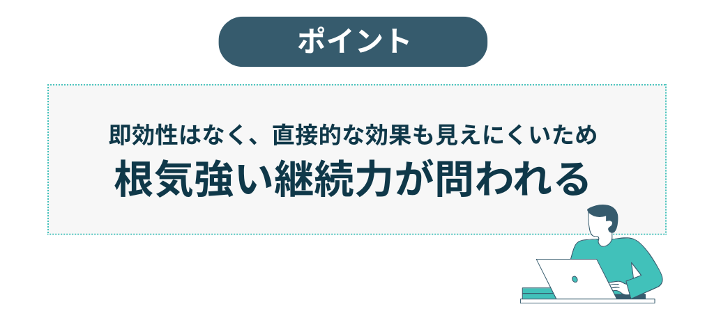そのため「作業負荷がかかる割に成果が見えにくい」と感じてしまい、途中で「やっている意味があるのか・・・」と悩んだり、そのまま運用が途切れてしまったりすることも珍しくありません。