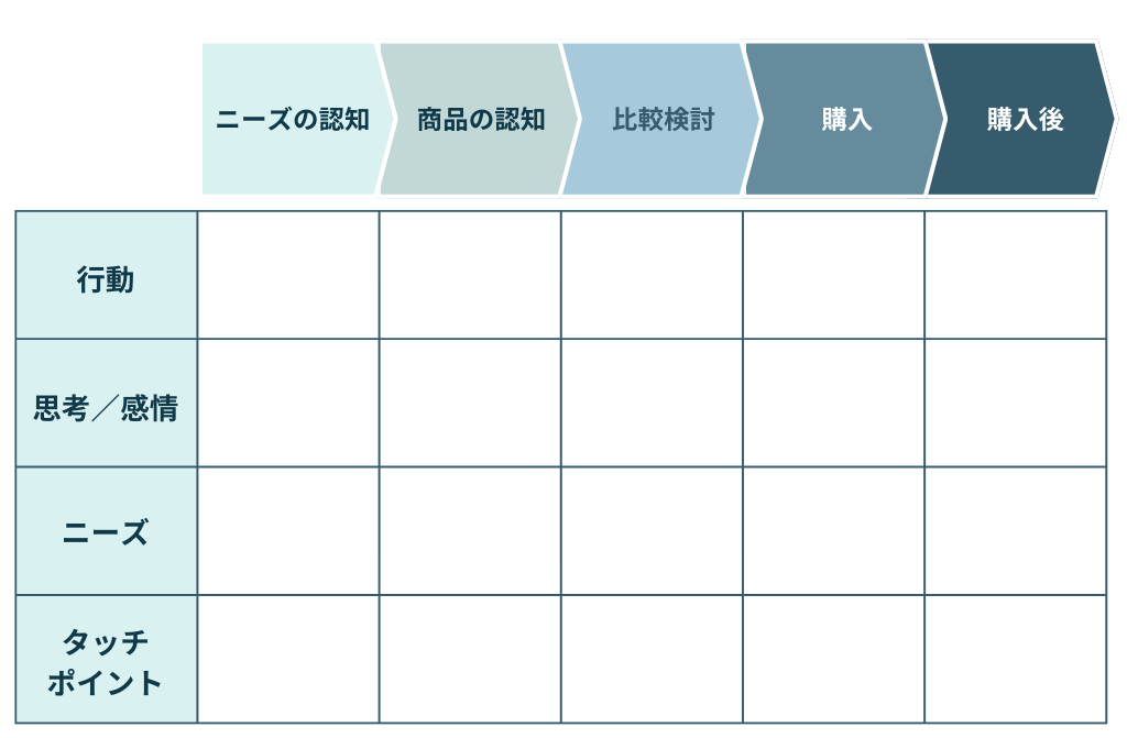 カスタマージャーニーマップとは、ユーザーが購入に至るプロセスを時系列に記したシートのことです。