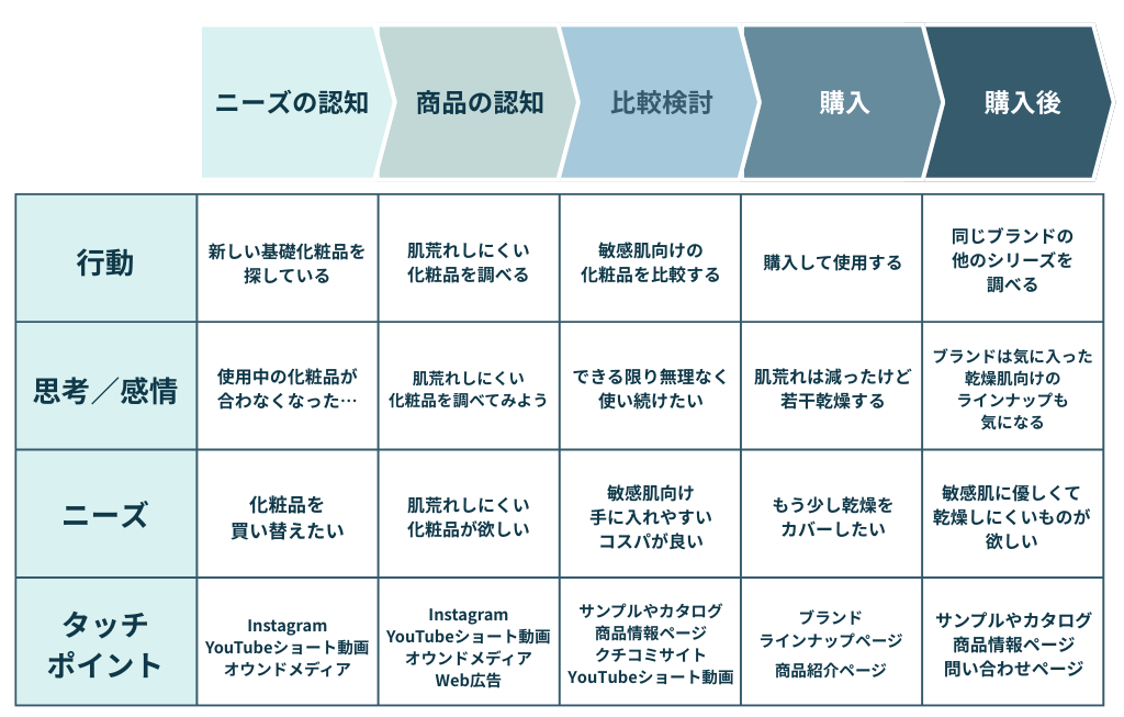 上記の項目をもとに、新開発した化粧品を販売する場合のカスタマージャーニーマップを作成してみました。ペルソナは先ほど例でご紹介したものになります。
