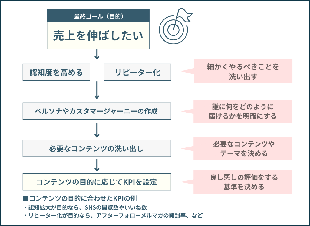 最終的にどういう目標を達成したいのかを明確にしたうえで、どういったコンテンツを作るべきなのかを決める、という考え方が重要です。