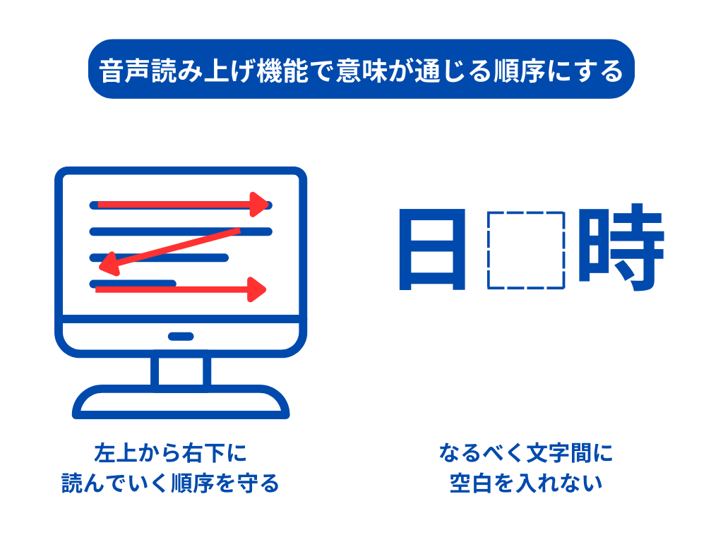 また、空白を入れることで意味が通らなくなってしまう言葉もあります。例えば「日時」と表記する時に、「日」と「時」の間に空白を入れると、「ひ、とき」という風に読み上げられます。そうするとまたニュアンスが違いますよね。こういった点にも気を付けてコンテンツを作らなければなりません。