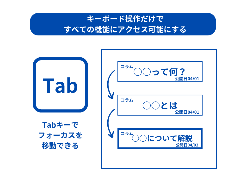 そこで、Webサイト内では機能をキーボードですべて操作できるようにし、かつ選択中の要素を枠線等で囲むフォーカスインジケーターが表示されるようにする必要があります。