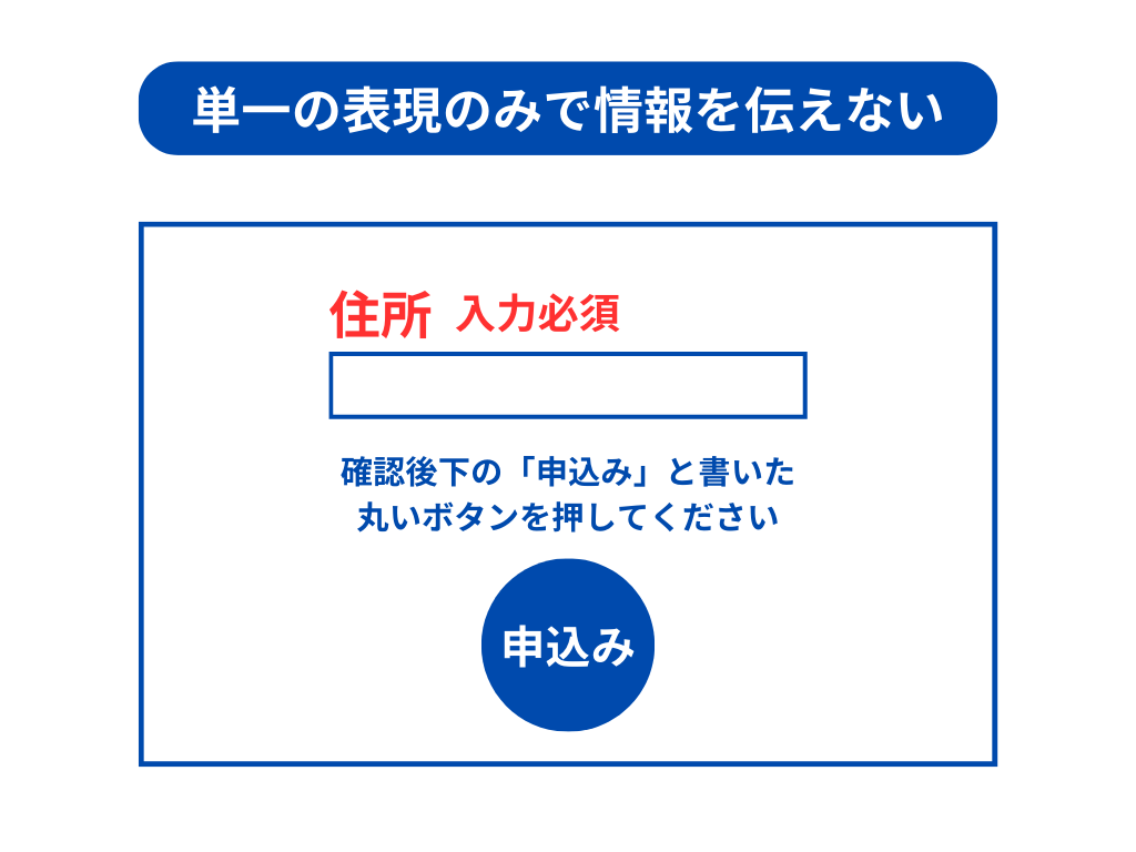 「丸いボタンを選択してください」と書いて丸いボタンだけを設置したり、「赤字部分は入力必須です。」と書いて赤字で項目が書いてあったりするのが、単一の表現のみで情報を伝えている状態です。