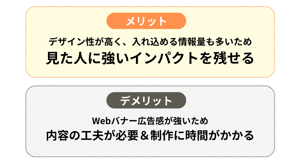 Webのバナー広告感が強いため、表示させる情報によってはクリックしてもらえない可能性が高くなります。また、デザイン要素が多い分、制作に時間がかかります。