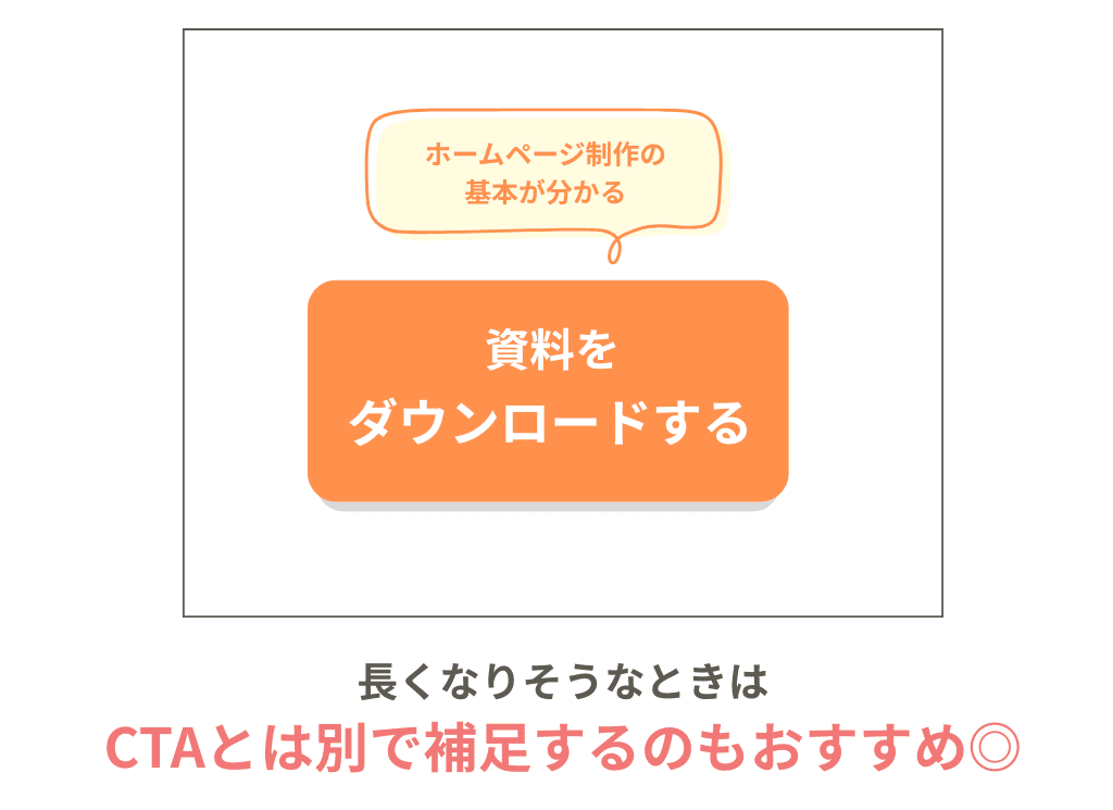 文字数が多くなりそうなときは、「資料ダウンロードはこちら」「ホームページ制作の基本が分かる」というようにボタンに記載する言葉と補足として記載する言葉に分けるのが良いでしょう。