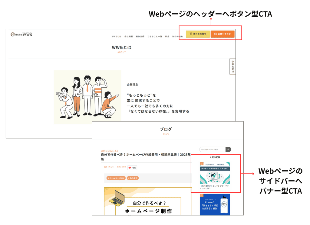 当社WWGのホームページでは下記の図のようにヘッダーやサイドバーにCTAを設置しています。