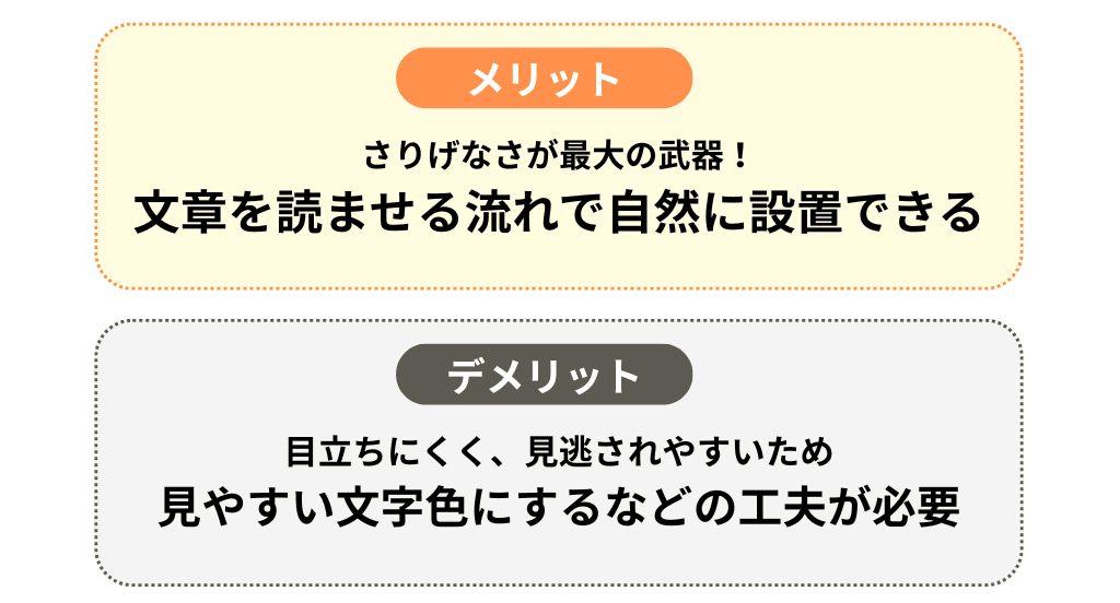 自然に挿入できる反面、目立ちにくく他の文章に埋もれて見逃されてしまうこともあります。そのため、視認性の高い文字色にするなどの工夫が必要です。