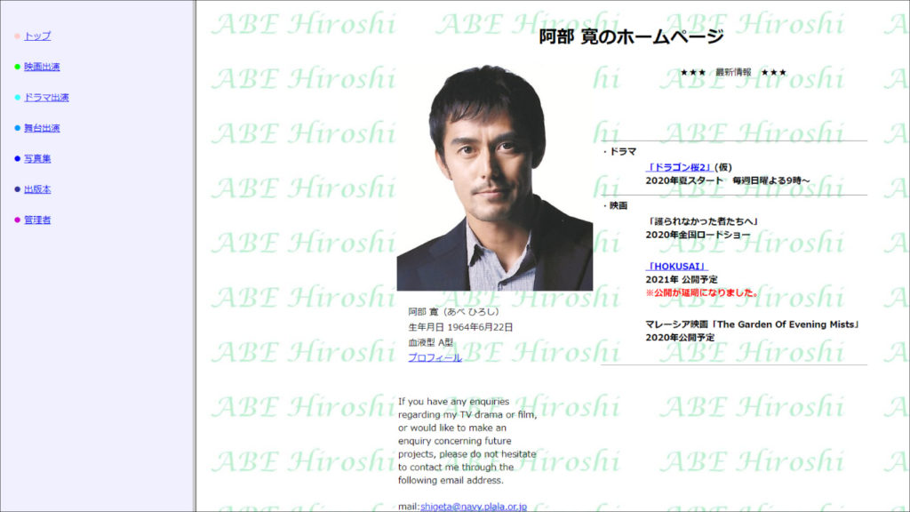 その影響で、趣味としてホームページ作成をする方も現れ始めました。一例として、俳優の阿部寛さんのホームページがあります。