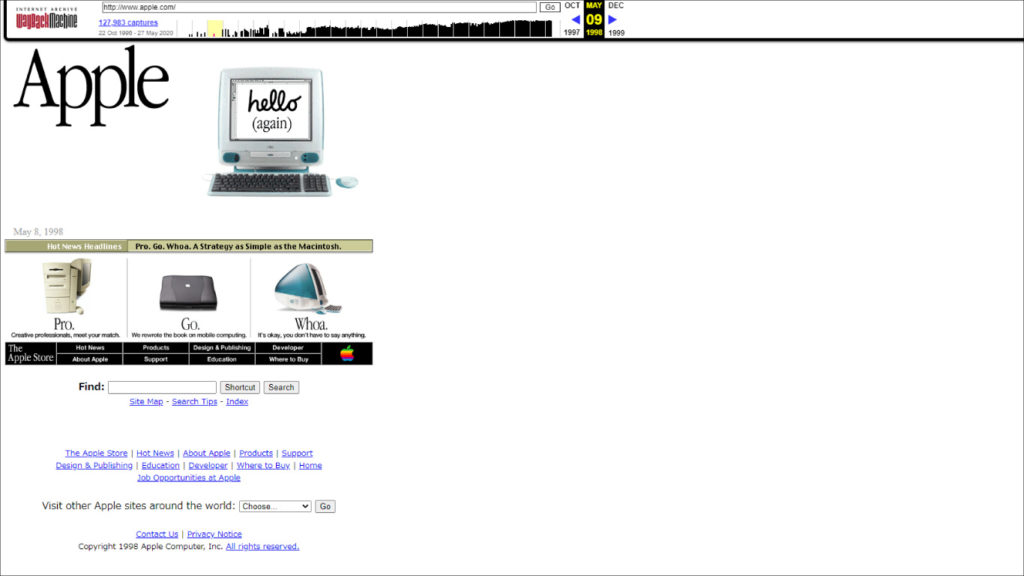 下記Appleの1998年のホームページをご覧いただけると想像しやすいかもしれませんが、トップページにマッキントッシュが3Dで回転しながら手前に近づいてくるようなイメージが貼られています。
