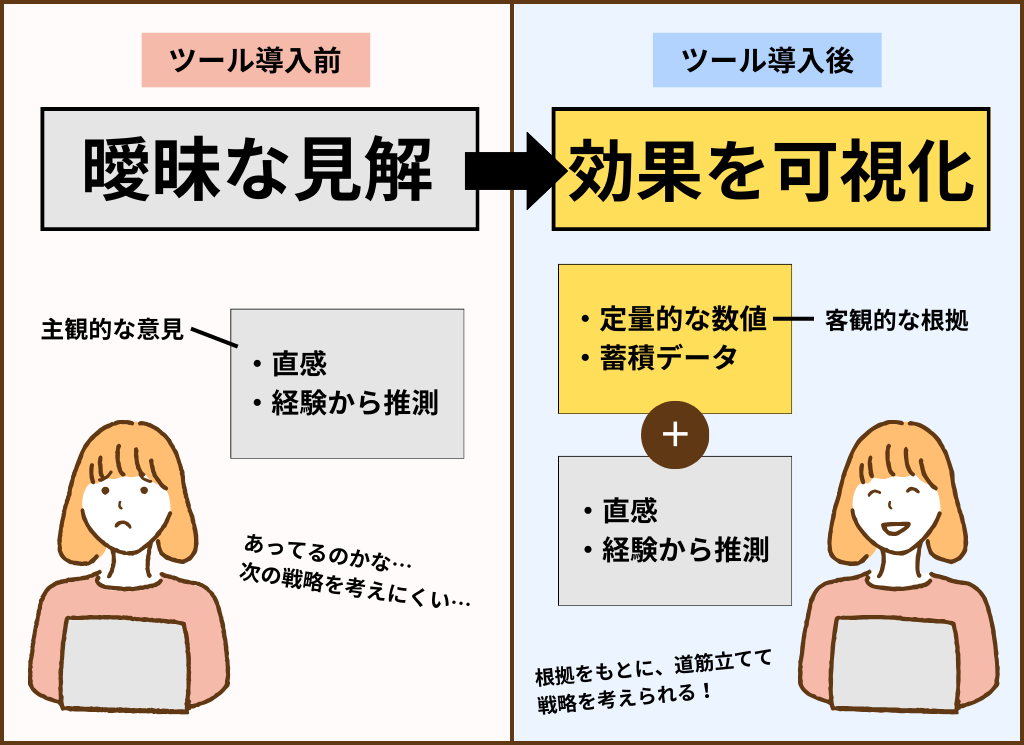 UGC活用ツールを導入する前と導入したあとの戦略の立ち方の比較図「曖昧な見解から、効果を可視化へ変化」