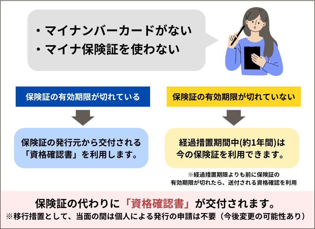 2024年12月2日(月)以降、マイナ保険証を利用していない場合、かつ、保険証の有効期限が切れてしまった場合は、保険証発行元から「資格確認書」が交付されます。そして医療機関の窓口にその資格確認証を持っていけば、これまで通り健康保険が適用されます。