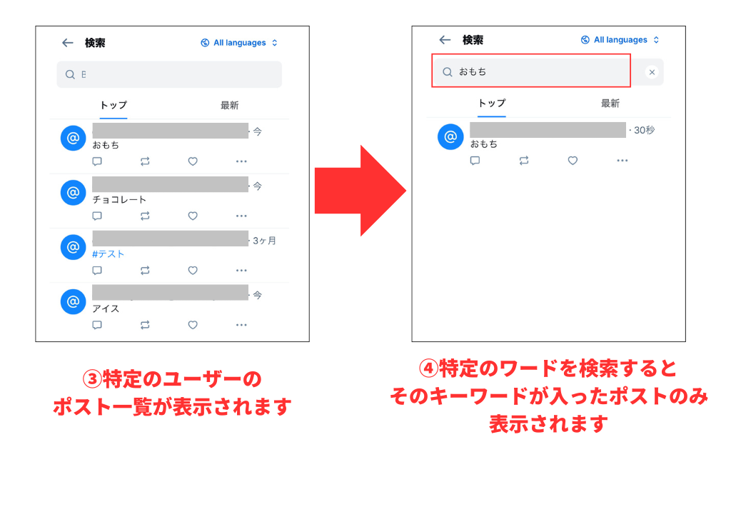 また、2024年10月11日にリリースされたアプリのバージョン1.92では、検索結果を言語別にフィルタリングできる機能も追加されています。日本語の投稿だけを確認したい場合などにとても便利です。検索結果の左上のプルダウンからフィルタをかけることができます。