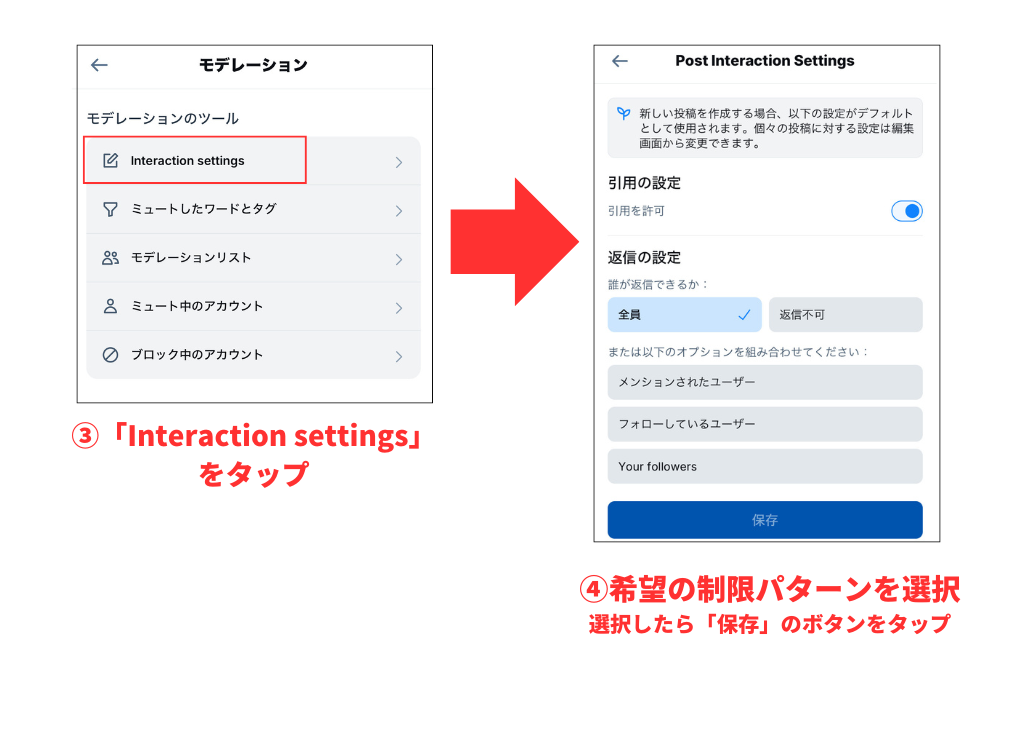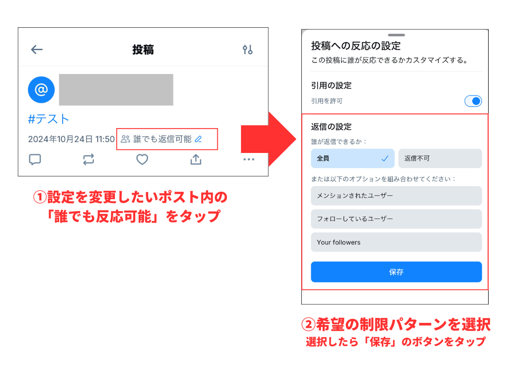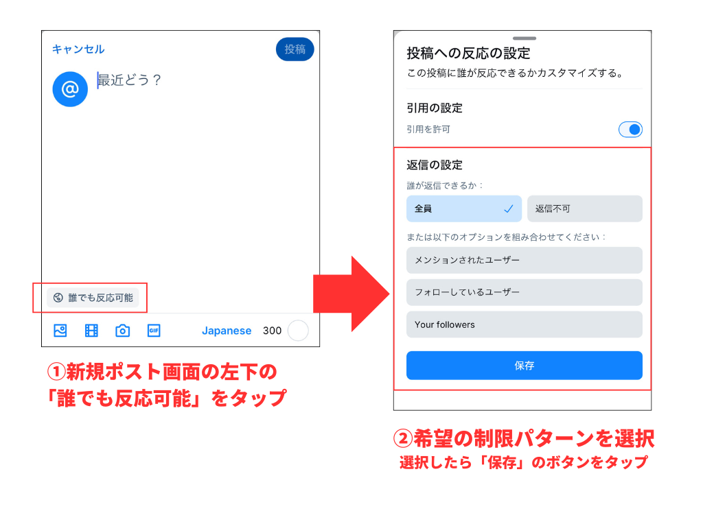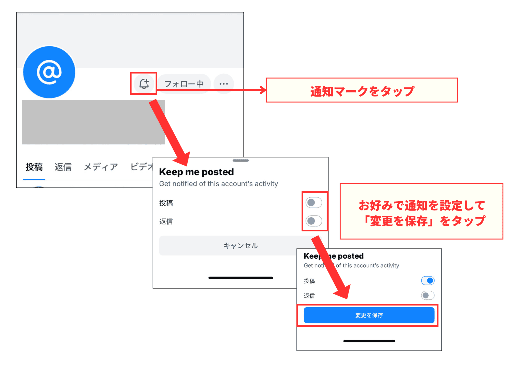 通知内容は、「投稿」「返信」の2種類を調整できるので、通知を受け取りたいものをオンにして「変更を保存」をタップします。