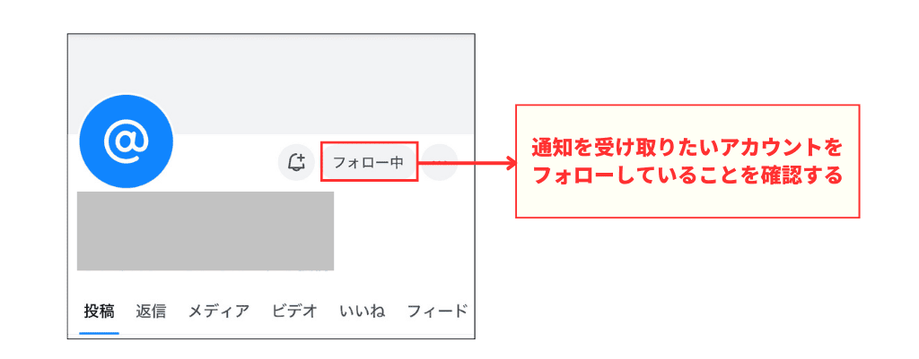 通知を受け取りたいアカウントのプロフィール欄を開きます。新着投稿の通知を受け取れるのは、フォローしているアカウントのみになるので、フォローされていることを確認してください。