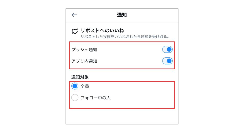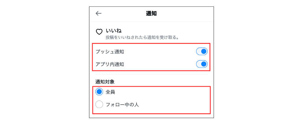 各通知の通知設定を開くと、通知方法では「プッシュ通知」「アプリ内通知」と表示され、通知対象は「全員」「フォロー中の人」から選べるので、お好みでカスタマイズしてください。