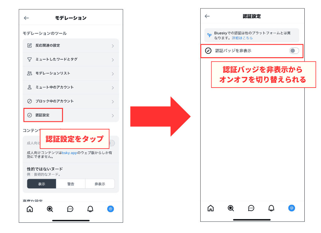 「認証設定」へと進み、「認証バッジを非表示」をオンにすると、認証バッジは一律で表示されなくなります。