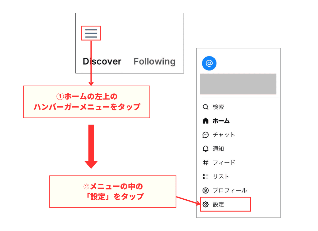 向かって左上の三本線(ハンバーガーメニュー)をタップしたら、「設定」をタップします。