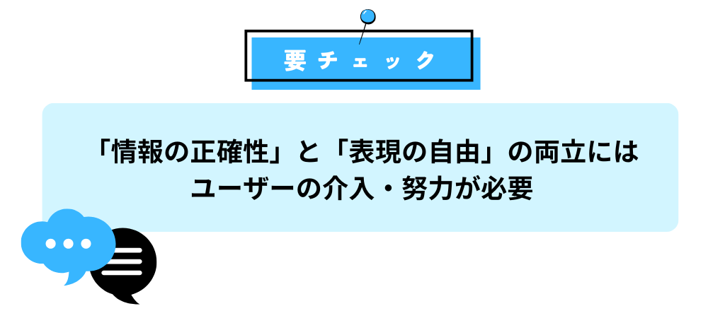 ここからは私の個人的な意見も入りますが、情報の正確性や妥当性を担保したうえでSNS上での表現の自由を守るためには、SNS利用者の介入・努力が必要な時代になったのだと感じます。