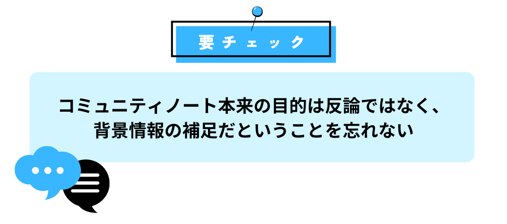 最も意識すべきはユーザーに正しい情報を届けることであるため、誤ったコミュニティノートの内容を正しく補足する内容をさらに投稿することも1つの手段です。