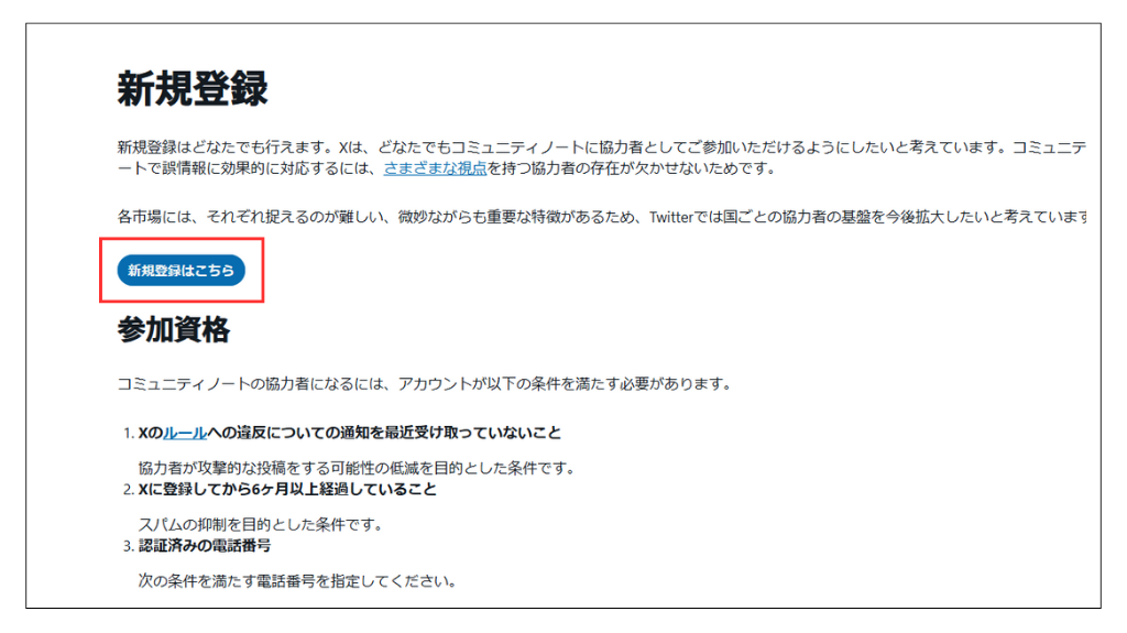 Xコミュニティノートに参加する際は、下記の公式ページ内の「新規登録はこちら」というボタンから登録を進めましょう。