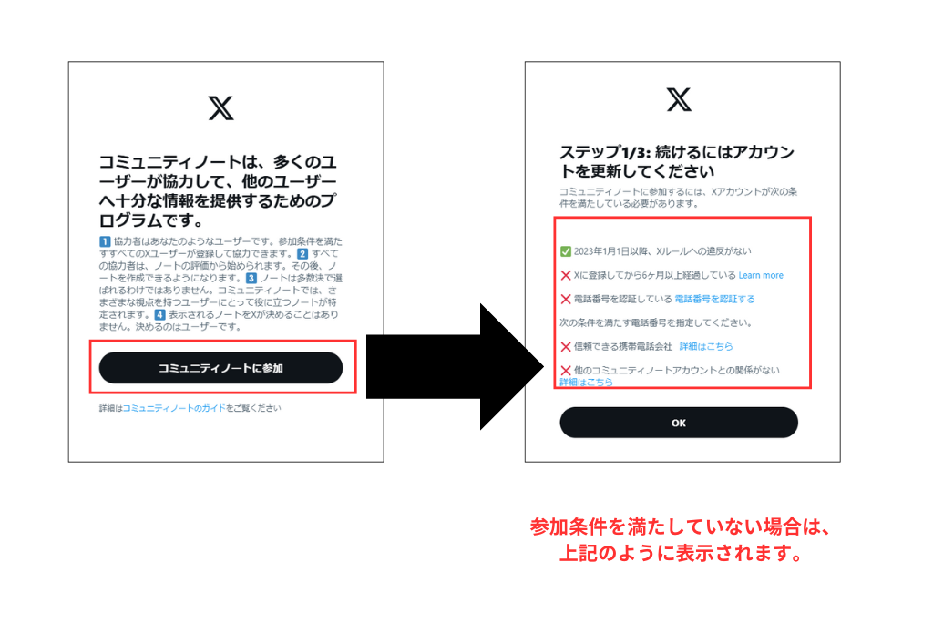 「コミュニティノートに参加」をクリックすると、参加条件を満たしている場合はそのまま参加できます。条件を満たしていない場合は、「×」が付いてしまった点を改善して、もう一度同じ手順で登録を進めます。