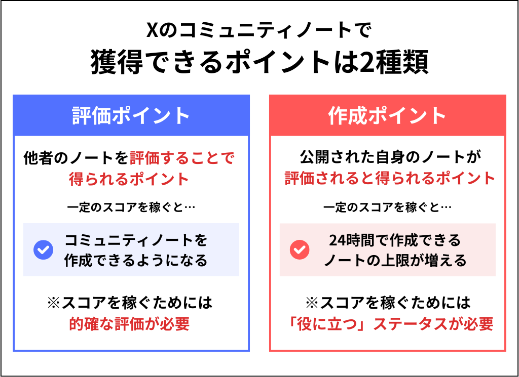 コミュニティノートで獲得すべきポイントは、「評価ポイント」と「作成ポイント」の2種類になります。このうち、コミュニティノートを作成するためにスコアを上げる必要があるのが評価ポイントです。
