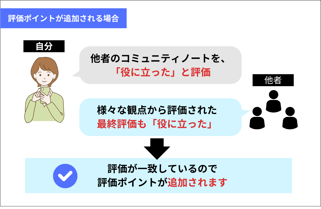 たとえば、既存のコミュニティノートを「役に立った」と評価したとします。そして、自分以外の他者からの評価もふまえた最終的な評価が「役に立った」だった場合、自身がおこなった評価と最終評価が「役に立った」で一致しているため、評価ポイントが追加されます。