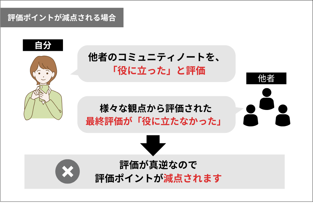 一方で、自分は「役に立った」と評価したコミュニティノートが、他者からの評価もふまえて最終的に「役に立たなかった」と評価された場合、自分がおこなった評価と、最終評価が真逆なので、この場合は的確な評価をおこなえなかったということで減点されるということになります。