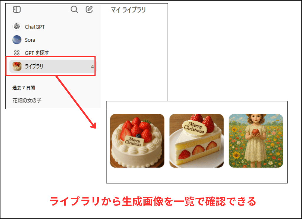 なお、2025年4月16日のアップデートによって、ChatGPTで生成した画像をライブラリから一覧で確認できるようになりました。