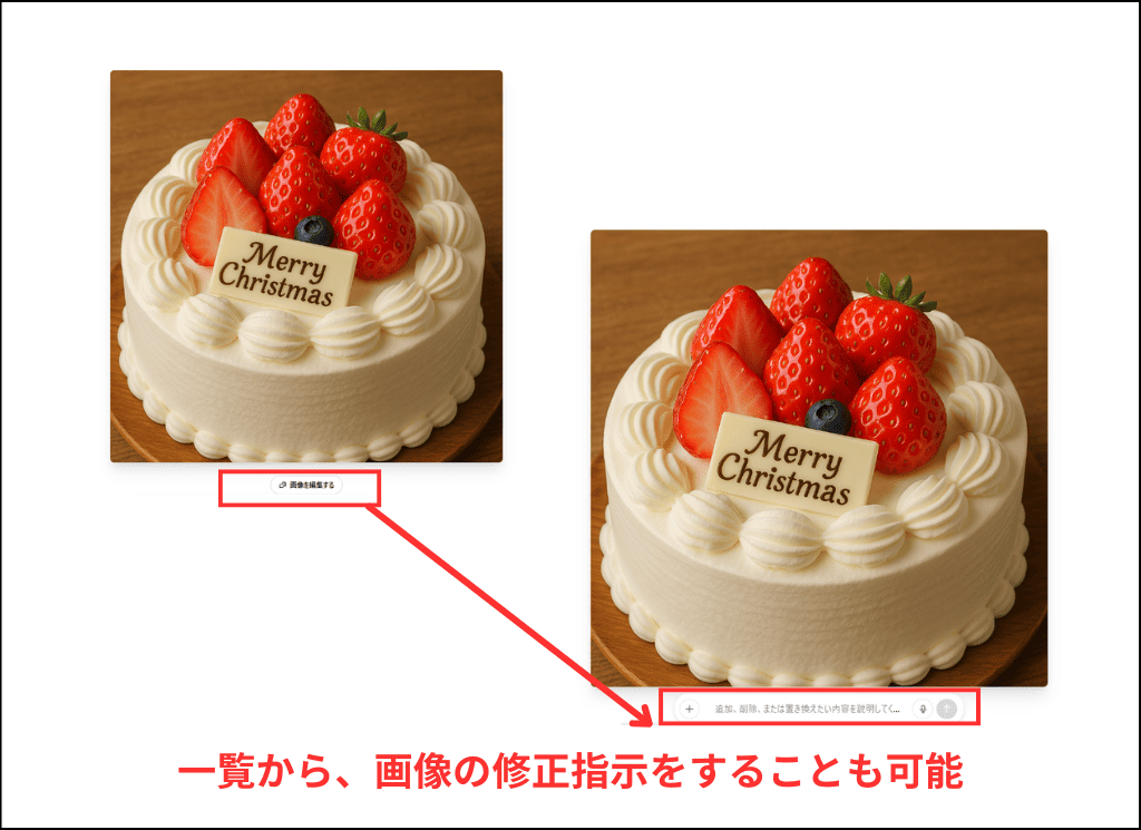 ケーキの細かい点は微妙に違いますが、簡潔なプロンプトでもケーキの特徴を捉えたうえで指示した通りの写真を作ってくれました。