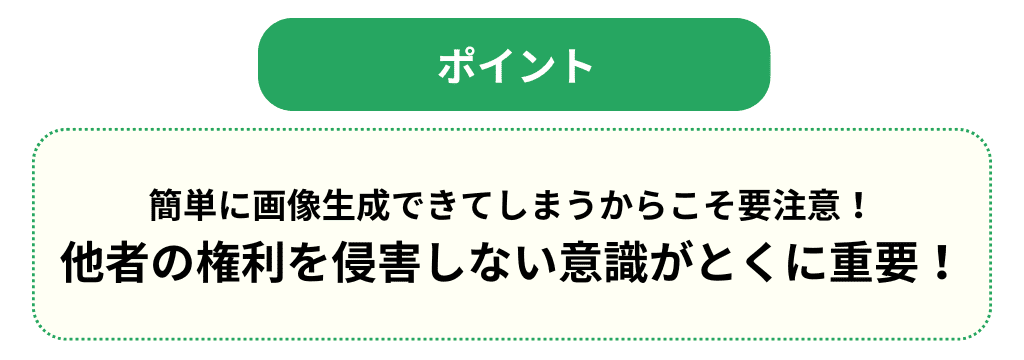 ここまで簡単に画像を生成できるようになったからこそ、知らず知らずのうちに他者の著作権を侵害してしまっていた・・・という事態にもなりかねません。