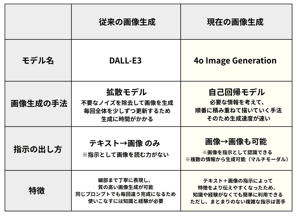 これまでの画像生成機能と、4o Image Generationの違いをまとめて表にしてみたのでご確認ください。(ここから少しだけ難しいお話も入ってきますが、要点はこの表にまとまっています)