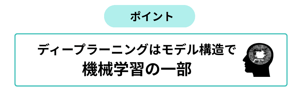つまり、機械学習とディープラーニングは並べて比べるものではなく、機械学習のなかにディープラーニングというモデル構造がある、というイメージになります。