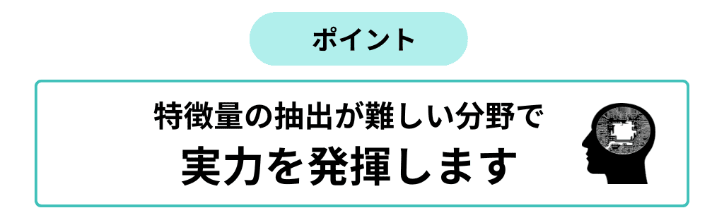 ディープラーニングの強みの1つは、人間による特徴量の抽出が不要になる点です。そのため、特徴量の数値化が難しい分野においてその強みを発揮しています。