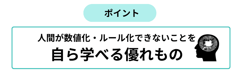 このように、人間が数値化して教えきれないことを自ら学んだり、人間では見逃してしまうような複雑なルールを発見できたりする点は、ディープラーニングのメリットと言えるでしょう。