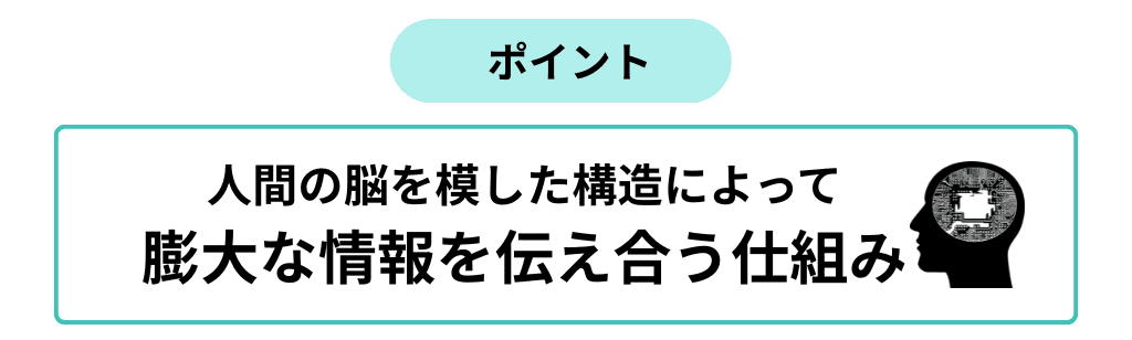 ニューラルネットワークは、人間の脳にある神経細胞(ニューロン)の働きを模倣した構造をしており、情報を伝え合いながら複雑な判断を行えるようになっています。この仕組みによって、より人間に近い思考や考え方を持つ点が、ディープラーニングの大きな特長です。