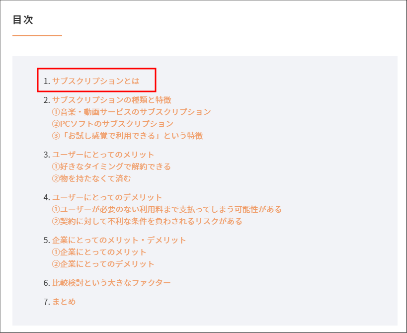 すると、「サブスクリプションとは」がまず見出しに含まれているかを確認します。