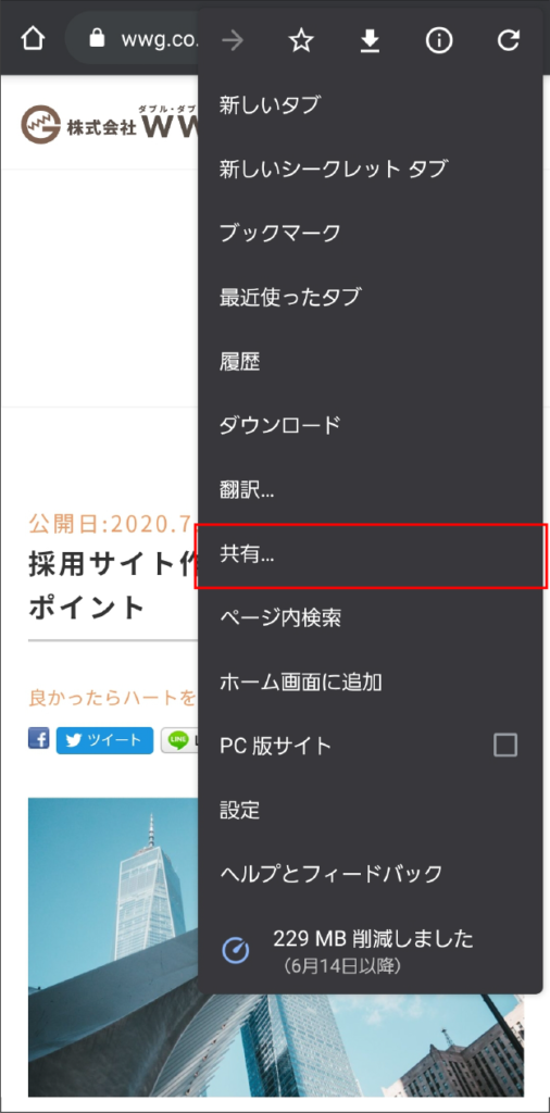ブラウザの「共有」をタップします。