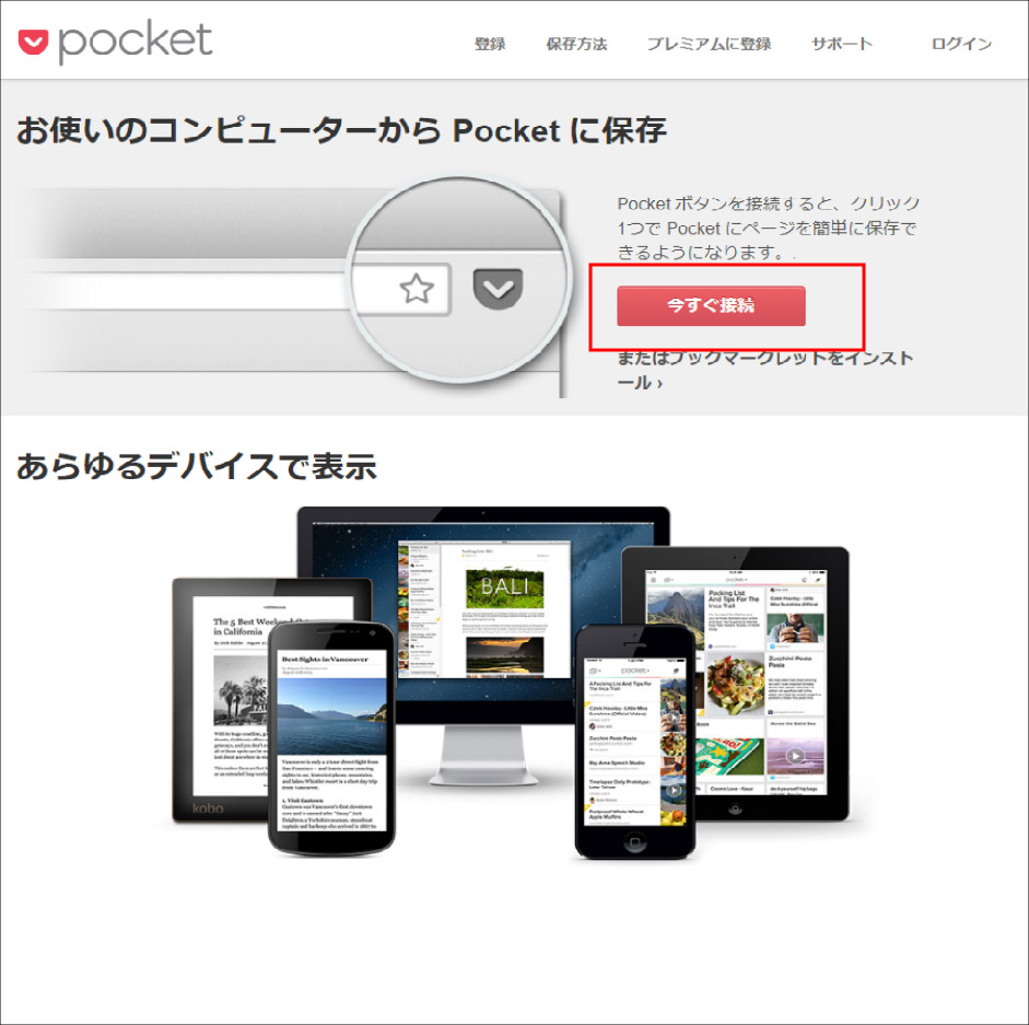 ①保存方法のページ( https://getpocket.com/add )から「今すぐ接続」をクリックします。