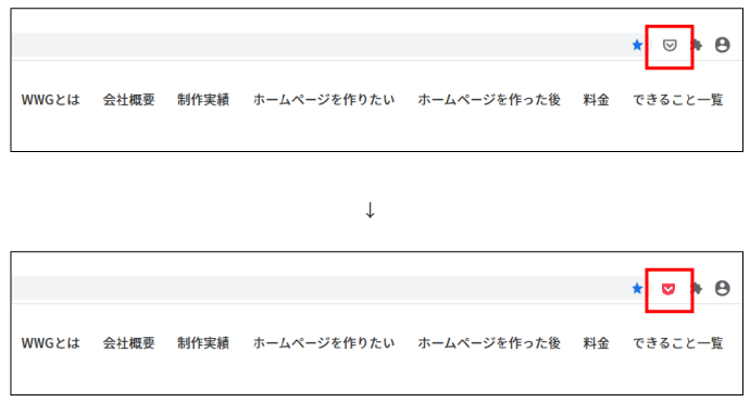 右上のアイコンバーのポケット型のアイコンをクリックします。アイコンが赤に変わればページのPocketへの保存は完了です。
